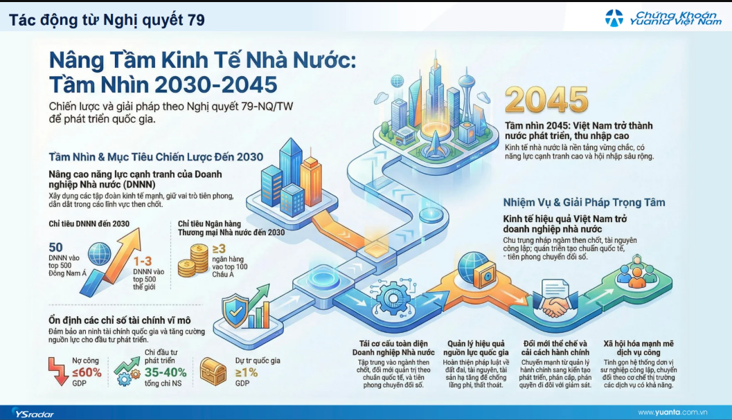 Theo phân tích của YSVN, Nghị quyết 79 không chỉ thay đổi tư duy quản lý vốn Nhà nước, mà còn tạo ra các cơ chế đủ mạnh để tác động trực tiếp tới dòng tiền, cung – cầu cổ phiếu và triển vọng định giá trên thị trường chứng khoán.