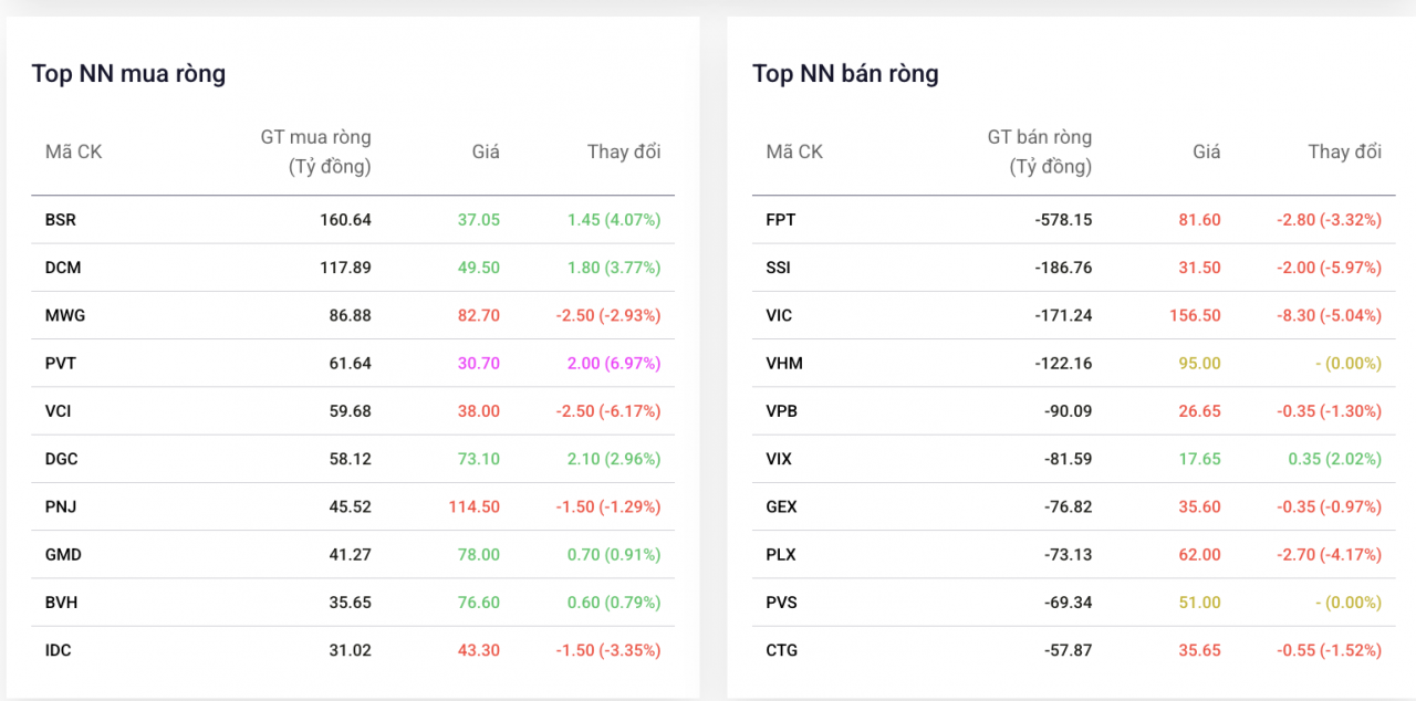 Ở chiều ngược lại, vẫn có một số cổ phiếu được khối ngoại mua ròng đáng kể, dẫn đầu là BSR (160 tỷ đồng), DCM (118 tỷ đồng), MWG (87 tỷ đồng) và PVT (62 tỷ đồng).