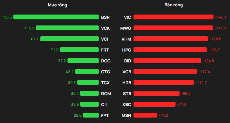 Tại chiều mua, cổ phiếu BSR được khối ngoại mua mạnh nhất trên HOSE với giá trị hơn 156 tỷ đồng. Theo sau, VCK và VCI là mã tiếp theo được gom mạnh 115 tỷ đồng và 107 tỷ đồng.