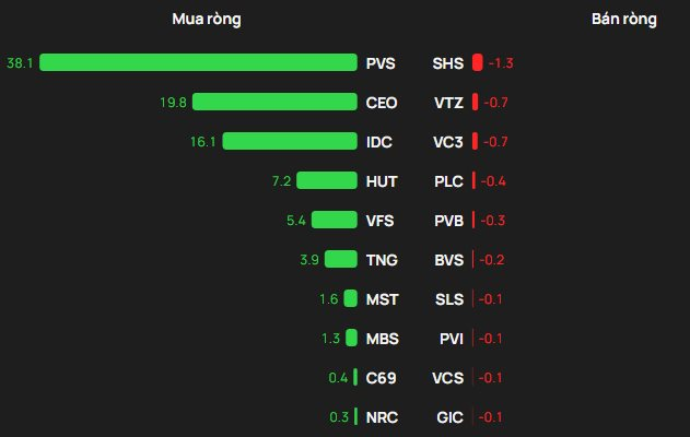 Tại chiều mua, PVS được mua ròng mạnh nhất với giá trị 38 tỷ đồng. Bên cạnh đó, CEO xếp tiếp theo trong sách mua ròng mạnh trên HNX với 20 tỷ đồng. Ngoài ra, khối ngoại cũng chi vài tỷ đồng để gom ròng IDC, HUT, VFS.