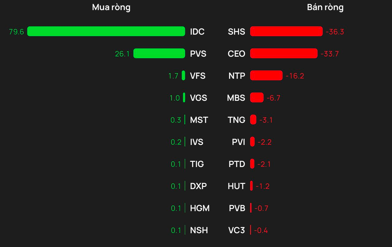 Chiều mua, khối ngoại ghi nhận lực “gom” mạnh nhất tại IDC (khoảng 80 tỷ đồng), theo sau là PVS (26 tỷ), VFS (1,7 tỷ), VGS (1 tỷ) và MST (0,3 tỷ).