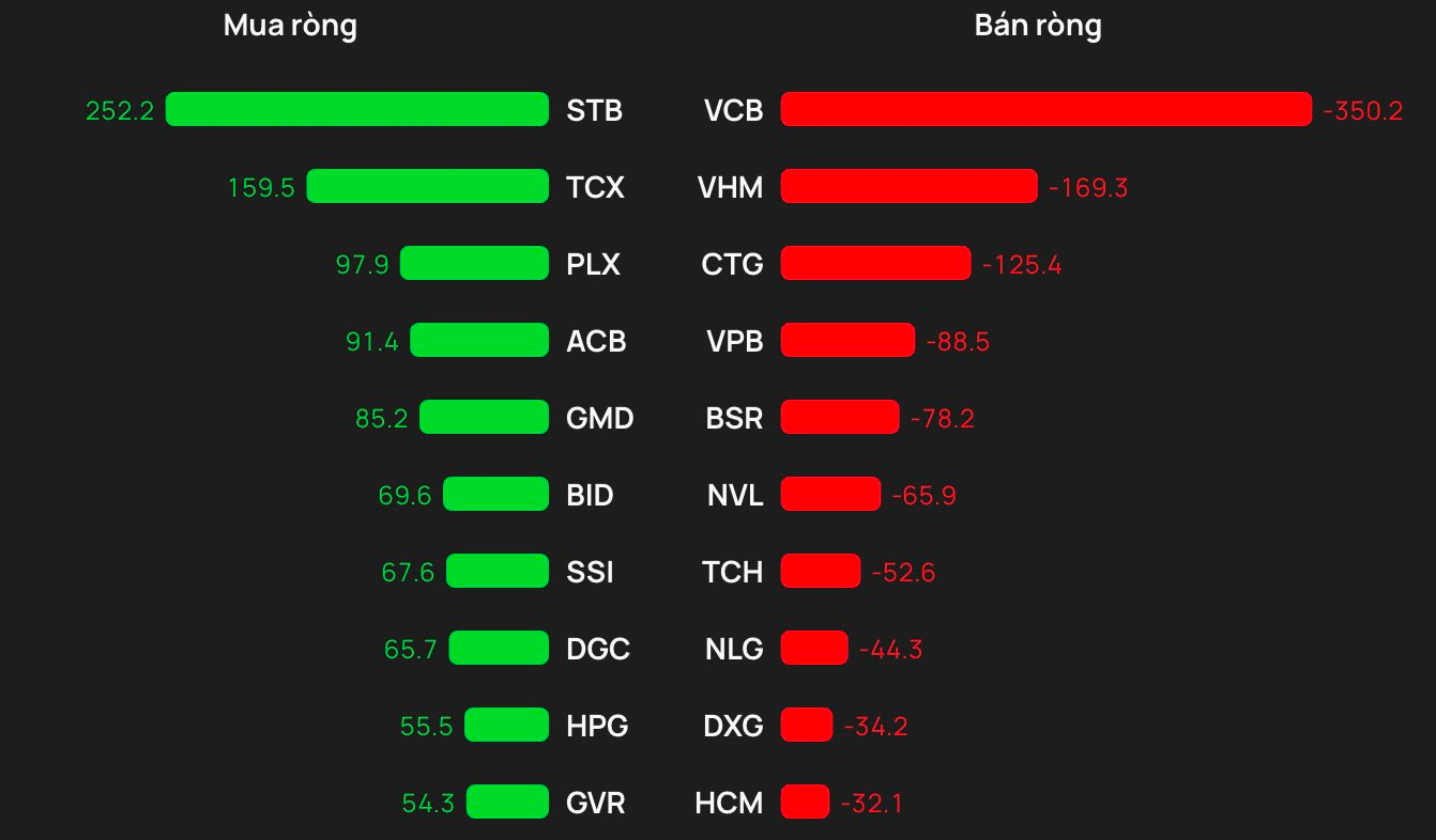 Chiều mua, khối ngoại mua ròng mạnh ở nhóm cổ phiếu tài chính, với STB đứng đầu (khoảng 252 tỷ đồng), theo sau là TCX (160 tỷ). Các mã như PLX (98 tỷ), ACB (91 tỷ) và GMD (85 tỷ) cũng được gom ròng mạnh hàng chục tỷ đồng mỗi mã.