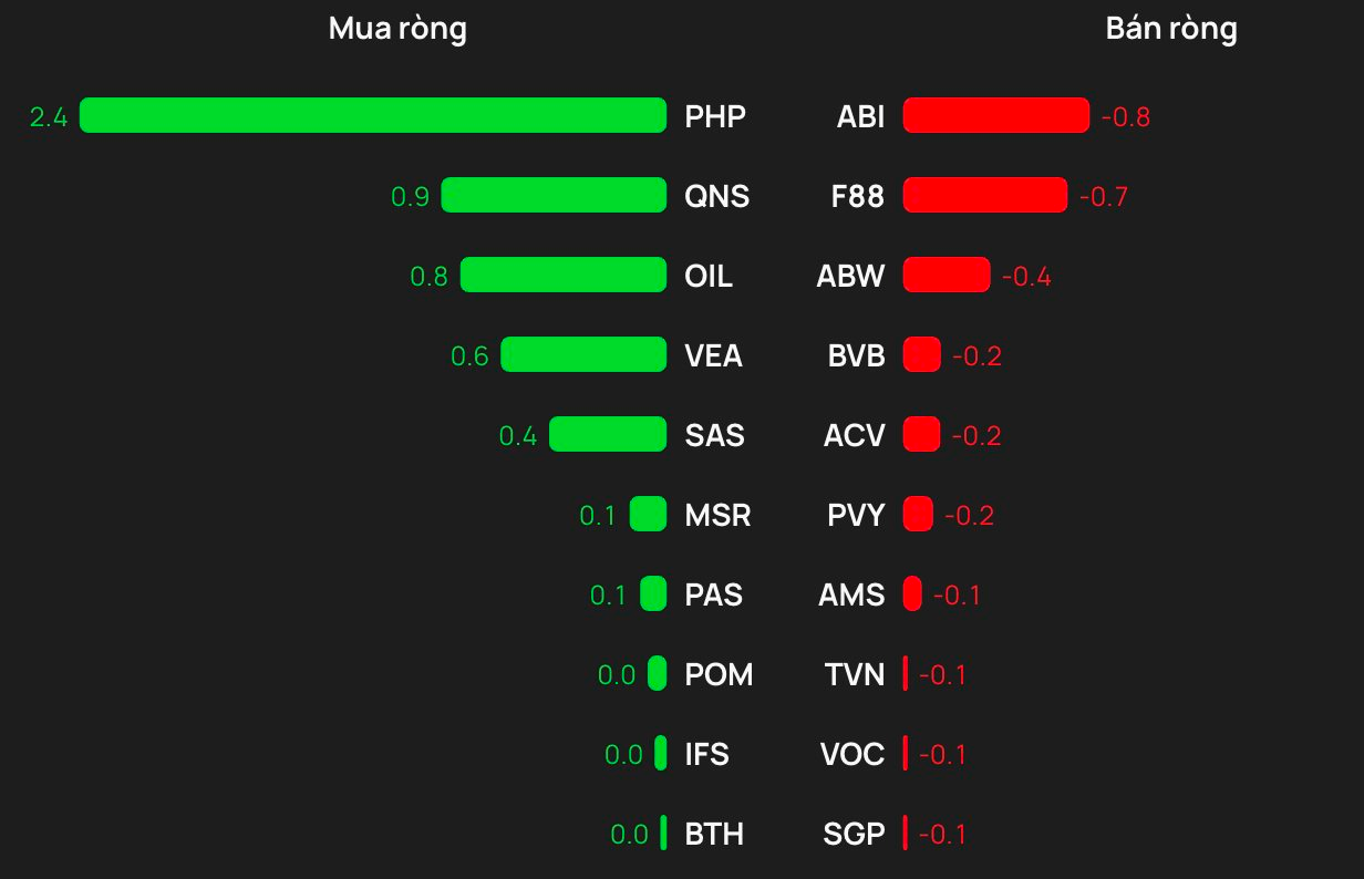 Chiều mua, khối ngoại mua ròng mạnh nhất là PHP (khoảng 2 tỷ đồng), theo sau QNS (0,9 tỷ), OIL (0,8 tỷ), VEA (0,6 tỷ) và SAS (0,4 tỷ) cũng được gom ròng không đáng kể.