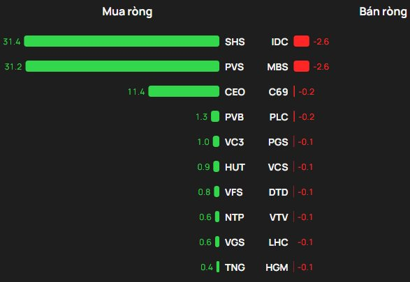 Tại chiều mua, SHS được mua ròng mạnh nhất với giá trị 31 tỷ đồng. Bên cạnh đó, PVS xếp tiếp theo trong sách mua ròng mạnh trên HNX với 31 tỷ đồng. Ngoài ra, khối ngoại cũng chi vài tỷ đồng để gom ròng CEO, PVB, VC3.