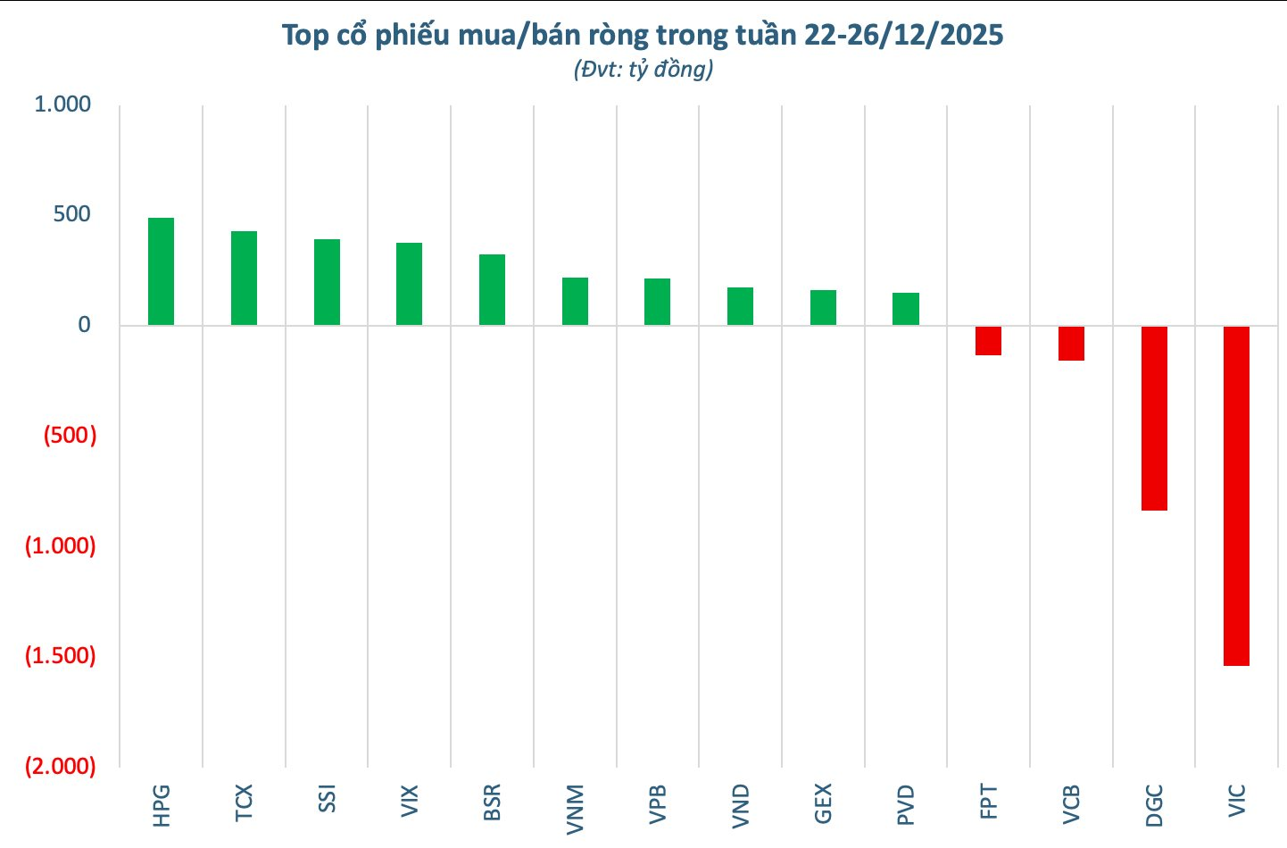 Ở chiều ngược lại, VIC là cổ phiếu bị bán ròng mạnh nhất với giá trị 527 tỷ đồng, bỏ xa các mã còn lại. Xếp sau là FPT với mức bán ròng 313 tỷ đồng và DGC bị bán ròng 301 tỷ đồng.