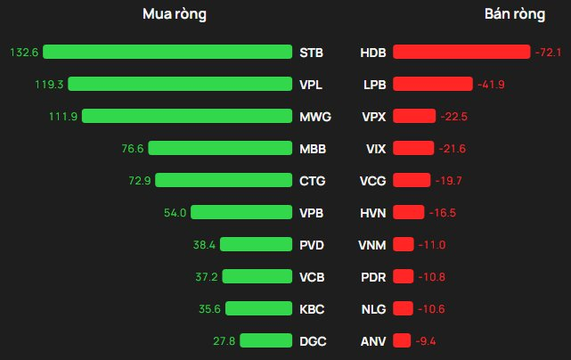 Tại chiều mua, cổ phiếu STB được khối ngoại mua mạnh nhất trên HOSE với giá trị hơn 133 tỷ đồng. Theo sau, VPL là mã tiếp theo được gom mạnh 119 tỷ đồng. Ngoài ra, MWG và MBB cũng được mua lần lượt 112 và 76 tỷ đồng.