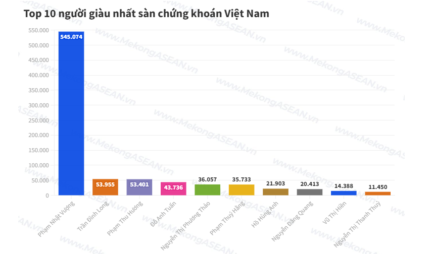 Không chỉ VIC, các mã khác trong nhóm Vingroup là VHM, VPL, VRE cũng tăng mạnh trong năm 2025, giúp ông Phạm Nhật Vượng giữ vững vị thế người giàu nhất sàn chứng khoán. Khối tài sản của ông ước đạt 545.000 tỷ đồng, vượt xa người thứ hai là Chủ tịch Hoà Phát Trần Đình Long.