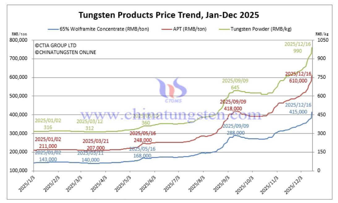 Giá vonfram trên thị trường quốc tế đang bước vào một chu kỳ tăng mạnh hiếm thấy. Theo dữ liệu thị trường cập nhật đến tháng 12/2025 cho thấy, hầu hết các sản phẩm vonfram chủ chốt đều ghi nhận mức tăng đáng kể. Đáng chú ý, giá quặng wolframite đã tăng gần 150% so với đầu năm, đưa mặt bằng giá vonfram lên mức cao nhất kể từ năm 2013.