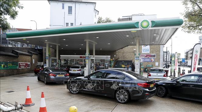 Các phương tiện xếp hàng chờ đổ xăng tại một trạm xăng ở London, Anh . Ảnh: THX/TTXVN