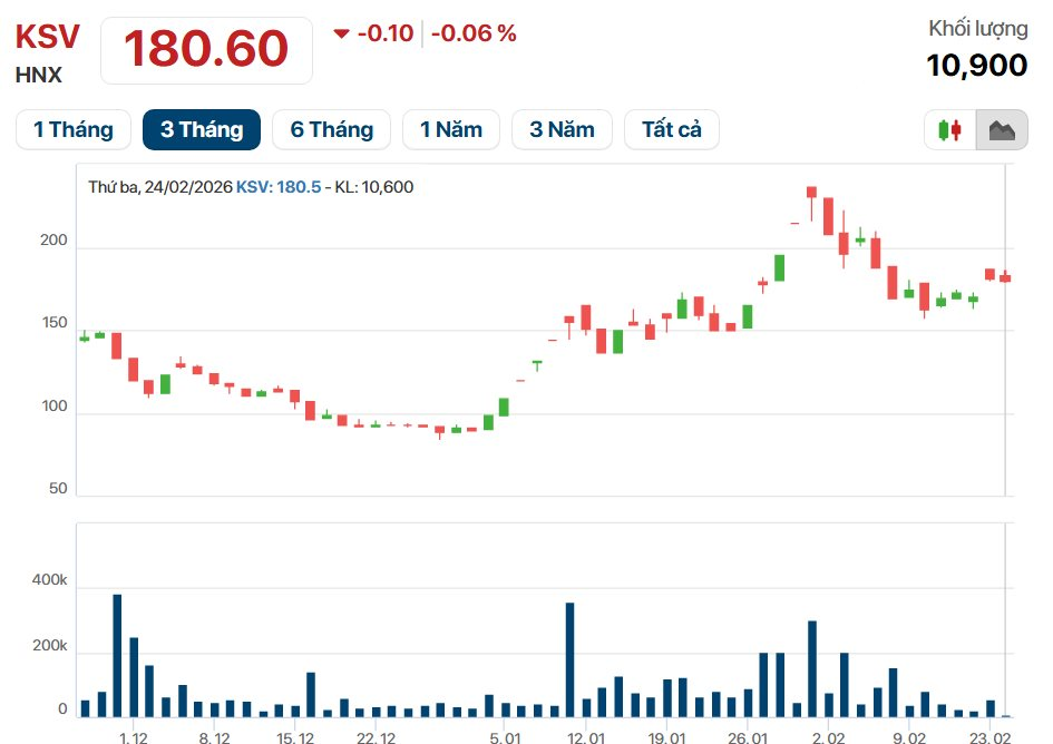 Trên thị trường, sau khi ghi nhận nhịp tăng mạnh lên vùng đỉnh lịch sử 230.700 đồng vào cuối tháng 1/2026, thị giá KSV đã xuất hiện những nhịp điều chỉnh. Tính đến phiên giao dịch ngày 24/02/2026, giá cổ phiếu KSV đang giao dịch quanh mức 179 - 180.000 đồng/cổ phiếu, giảm khoảng 22,4% so với mức đỉnh thiết lập hồi đầu năm. Diễn biến này tạo nên một bức tranh đa diện cho doanh nghiệp khai thác kim loại quý hàng đầu cả nước ngay trước thềm đại hội cổ đông quan trọng nhất năm.