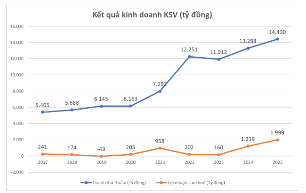 Kết thúc năm 2025, Vimico đạt doanh thu thuần 14.400 tỷ đồng, tăng hơn 1.100 tỷ đồng so với năm trước, trong khi lợi nhuận sau thuế hợp nhất xác lập kỷ lục mới ở mức 1.999 tỷ đồng, tăng trưởng 63,6% so với thực hiện của năm 2024. Kết quả rực rỡ này giúp lãi cơ bản trên mỗi cổ phiếu (EPS) của KSV đạt tới 10.115 đồng.