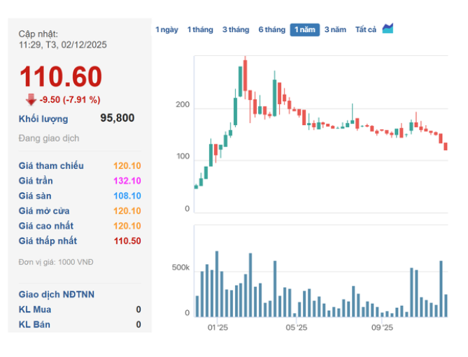 Trên thị trường chứng khoán, phiên ngày 2/12/2025, cổ phiếu KSV của Tổng công ty Khoáng sản - TKV (VIMICO) giao dịch với mức giá 112.000 đồng/cp, giảm 25% so với ngày 27/11 và giảm 60% so với hồi tháng 2/2025.