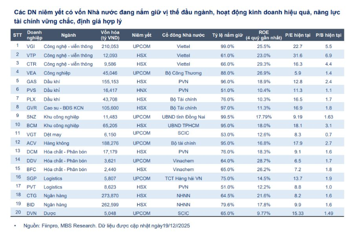 Cùng quan điểm, Chứng khoán MBS cho rằng nhóm doanh nghiệp niêm yết có vốn Nhà nước được kỳ vọng sẽ trở thành tâm điểm mới của thị trường trong năm 2026, khi Nghị quyết riêng về Kinh tế Nhà nước dự kiến được ban hành, tạo cú hích quan trọng về thể chế.