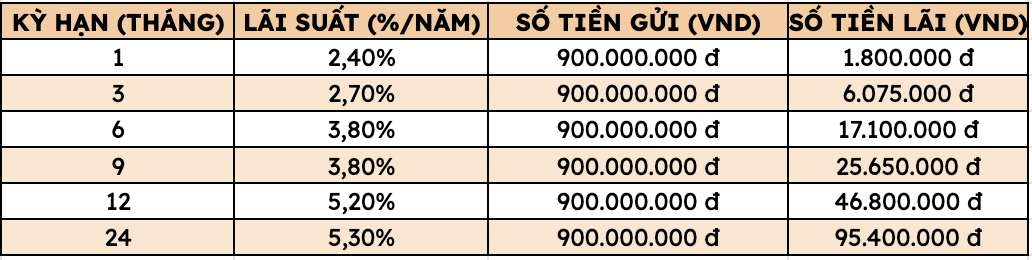 Như vậy, gửi 900 triệu đồng tại Agribank, khách hàng có thể nhận mức lãi cao nhất như sau (áp dụng với khách hàng cá nhân gửi trực tiếp tại quầy):