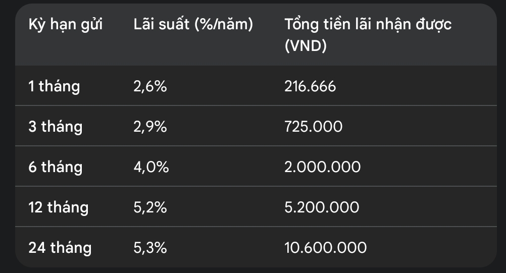 Lưu ý: Thông tin về lãi suất chỉ mang tính chất tham khảo và có thể thay đổi tùy theo từng thời kỳ.