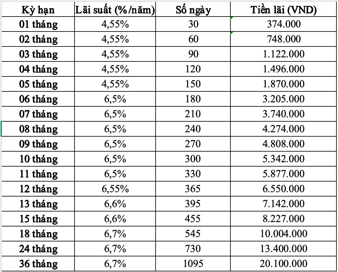 Với khoản tiền gửi từ 1 tỉ đồng trở lên cao hơn 0,2%/năm so với biểu lãi suất trên. Kỳ hạn 1-5 tháng là 4,75%/năm; kỳ hạn 6-11 tháng là 6,7%/năm; kỳ hạn 12 tháng là 6,75%/năm và kỳ hạn 13-15 tháng là 6,8%/năm và cao nhất lên đến 6,9%/năm với kỳ hạn 18-36 tháng.