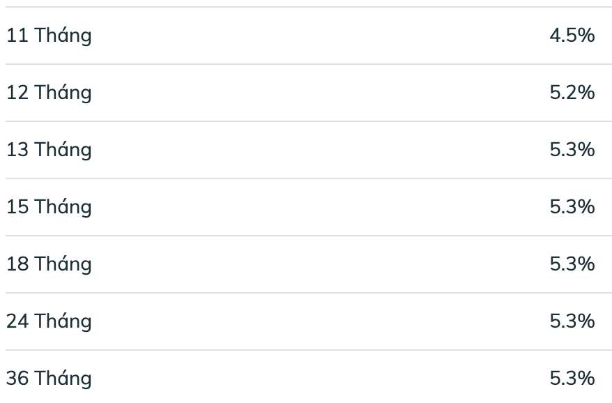 Lãi suất tiết kiệm tại BIDV kỳ hạn từ 6-11 tháng ở mức 4,5%/năm. Khách hàng gửi tiền 12 tháng nhận lãi suất ở mức 5,2%/năm; từ 13-36 tháng nhận lãi suất cao nhất ở mức 5,3%/năm.