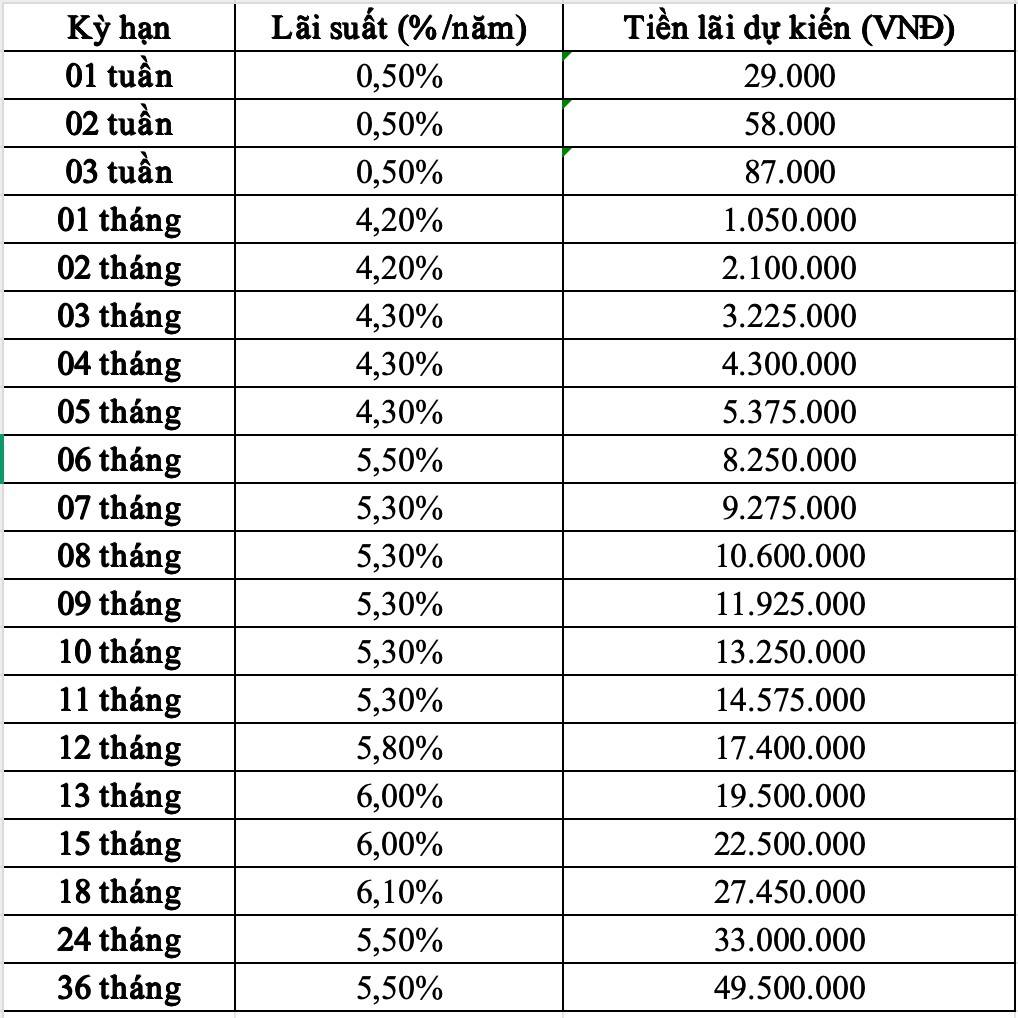 Kỳ hạn có lãi suất cao nhất là 18 tháng (6,10%/năm), mang lại khoản lãi 27,45 triệu đồng.