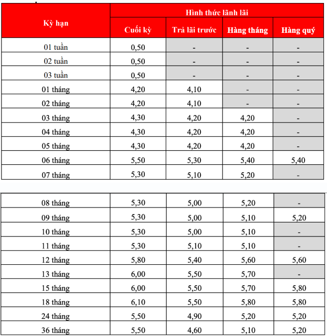 Theo biểu lãi suất hiện hành, lãi suất các kỳ hạn ngắn vẫn rất cạnh tranh: kỳ hạn 1-2 tháng là 4,20%/năm; kỳ hạn 3-5 tháng là 4,30%/năm.