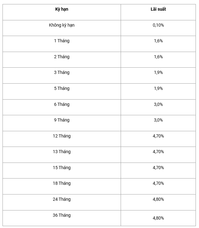 Kỳ hạn 6 tháng và 9 tháng có lãi suất là 3%/năm. Các khoản tiền gửi kỳ hạn 12 - 18 tháng được áp dụng cùng mức lãi suất 4,7%/năm. Kỳ hạn 24 - 36 tháng được áp dụng lãi suất cao nhất là 4,8%/năm.