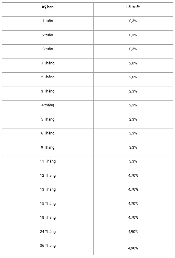Theo đó, tiền gửi kỳ hạn 1 - 3 tuần được hưởng lãi suất 0,3%/năm; kỳ hạn 1 - 2 tháng là 2%/năm; kỳ hạn 3 - 5 tháng là 2,3%/năm; kỳ hạn 6 - 11 tháng là 3,3%/năm; kỳ hạn 12 - 18 tháng là 4,7%/năm và kỳ hạn 24 - 36 tháng là 4,9%/năm .
