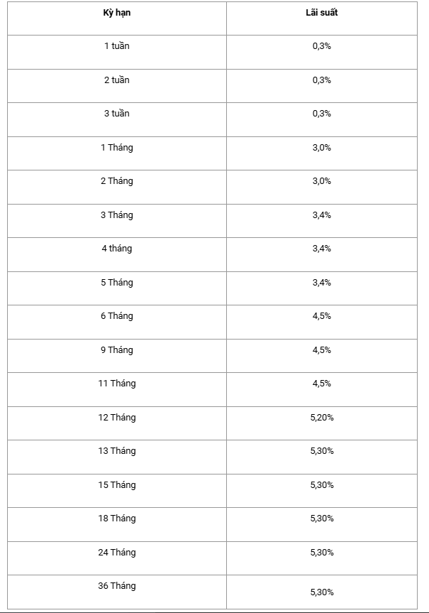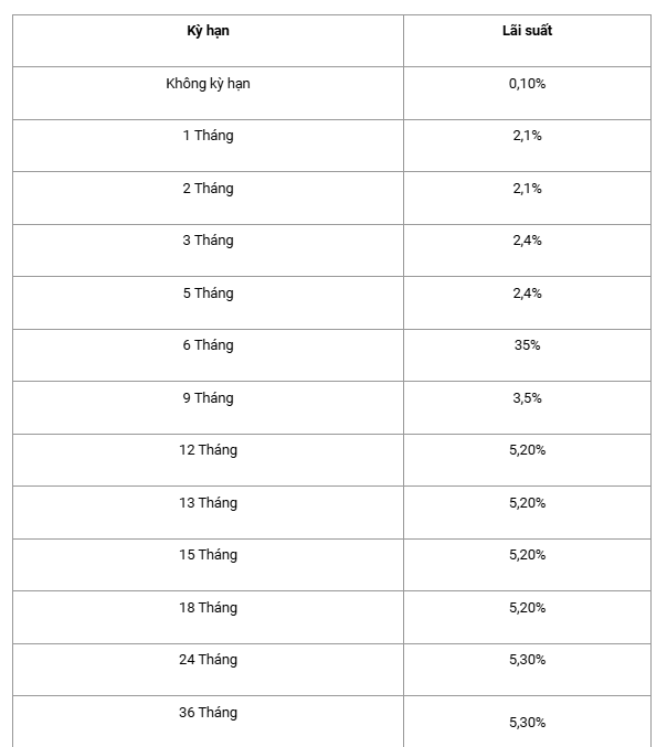 Ở nhóm kỳ hạn từ 6 đến 11 tháng, lãi suất tiền gửi online đang ở mức 4,5%/năm. Với kỳ hạn 12 tháng, lãi suất được niêm yết 5,2%/năm. Các kỳ hạn từ 13 tháng trở lên, bao gồm 24 tháng và 36 tháng, tiếp tục duy trì mức lãi suất cao nhất là 5,3%/năm.