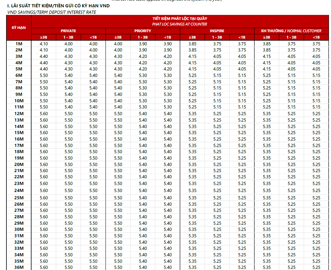 Trước đó, theo biểu lãi suất tháng 2, Techcombank áp dụng mức lãi suất tại quầy khoảng 3,55–3,95%/năm đối với kỳ hạn ngắn và khoảng 5,05%/năm cho kỳ hạn từ 12 tháng trở lên.