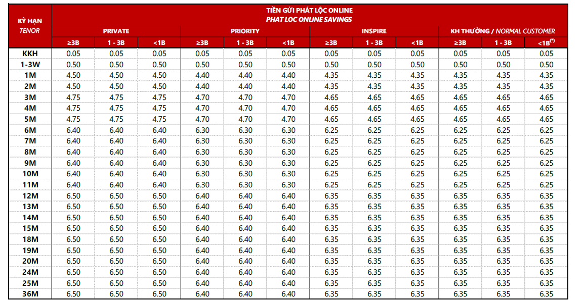 Đối với nhóm kỳ hạn từ 6 đến 11 tháng, lãi suất tiền gửi trực tuyến phổ biến ở mức 6,25%/năm. Trong khi đó, các kỳ hạn từ 12 tháng trở lên được nâng lên mức 6,35%/năm đối với khách hàng thông thường, trong khi nhóm khách hàng ưu tiên hoặc khoản tiền gửi lớn có thể được áp dụng mức cao hơn, lên tới 6,5%/năm.
