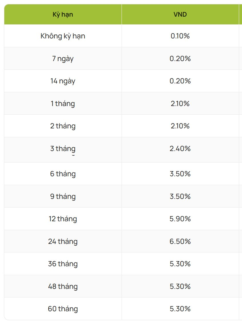 Đối với hình thức gửi tiền trực tuyến, mặt bằng lãi suất tiếp tục được duy trì tương đương so với gửi tại quầy. Theo đó, các kỳ hạn 1, 3, 6 và 9 tháng lần lượt có lãi suất 2,10%/năm, 2,40%/năm và 3,50%/năm, trong khi kỳ hạn 12 tháng và 24 tháng lần lượt đạt 5,9%/năm và 6,5%/năm.