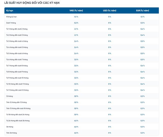 Đối với nhóm kỳ hạn từ 6 đến dưới 12 tháng, lãi suất cũng được duy trì ổn định ở mức 3,5%/năm, cho thấy ngân hàng chưa có điều chỉnh ở nhóm kỳ hạn ngắn và trung hạn trong kỳ này.