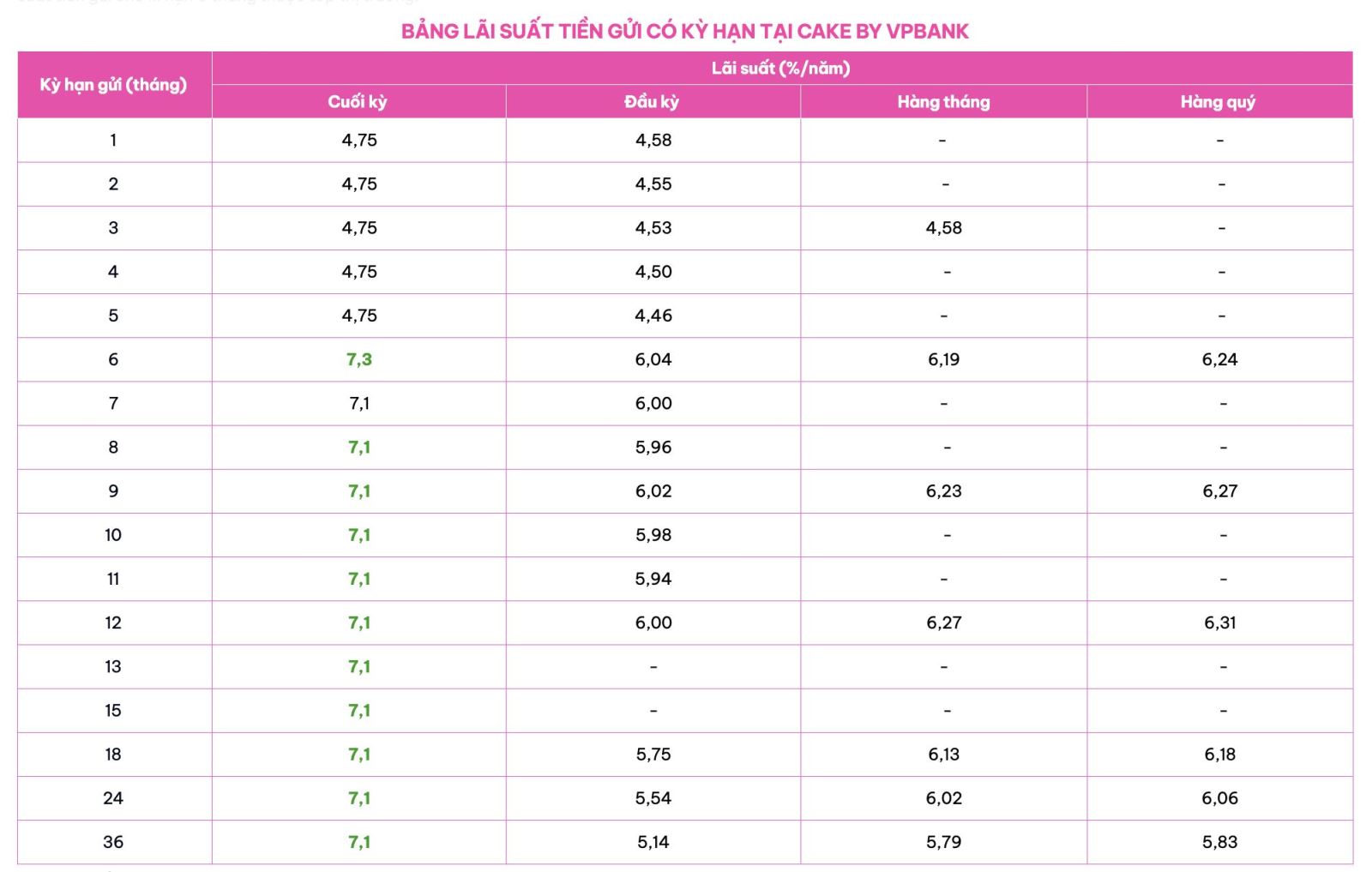 Biểu lãi suất niêm yết chính thức của Cake by VPBank, kỳ hạn 6 tháng lên đến 7,3%/năm. Nguồn: Cake by VPBank