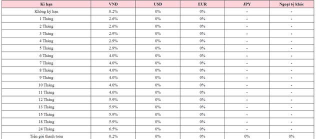 Cụ thể, lãi suất không kỳ hạn duy trì ở mức 0,1%/năm. Các kỳ hạn ngắn từ 1–2 tháng đang ở mức 2,1%/năm, kỳ hạn 3 tháng là 2,4%/năm.