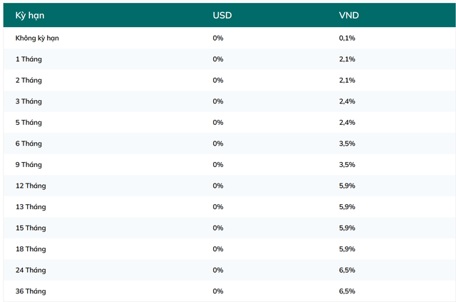 Theo đó, các kỳ hạn ngắn 1–2 tháng được niêm yết ở mức 2,1%/năm, kỳ hạn 3–5 tháng là 2,4%/năm. Lãi suất kỳ hạn 6–9 tháng đạt 3,5%/năm.