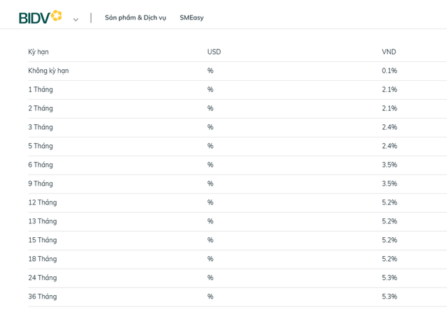Biểu lãi suất BIDV niêm yết trên website ngân hàng