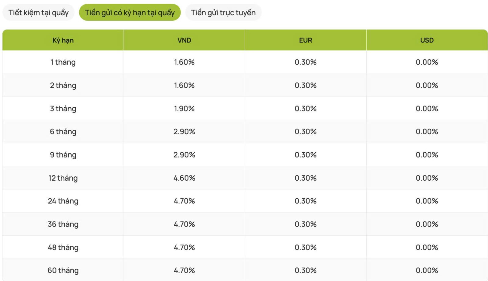 Theo ghi nhận của Lao Động, lãi suất tiền gửi tiết kiệm tại quầy của Ngân hàng TMCP Ngoại thương Việt Nam (Vietcombank) hiện dao động trong khoảng 1,6 - 4,7%/năm.