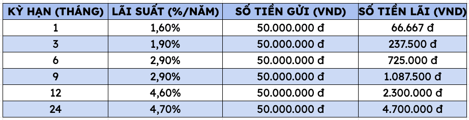 Gửi 50 triệu đồng tại Vietcombank nhận lãi bao nhiêu tại các kỳ hạn?