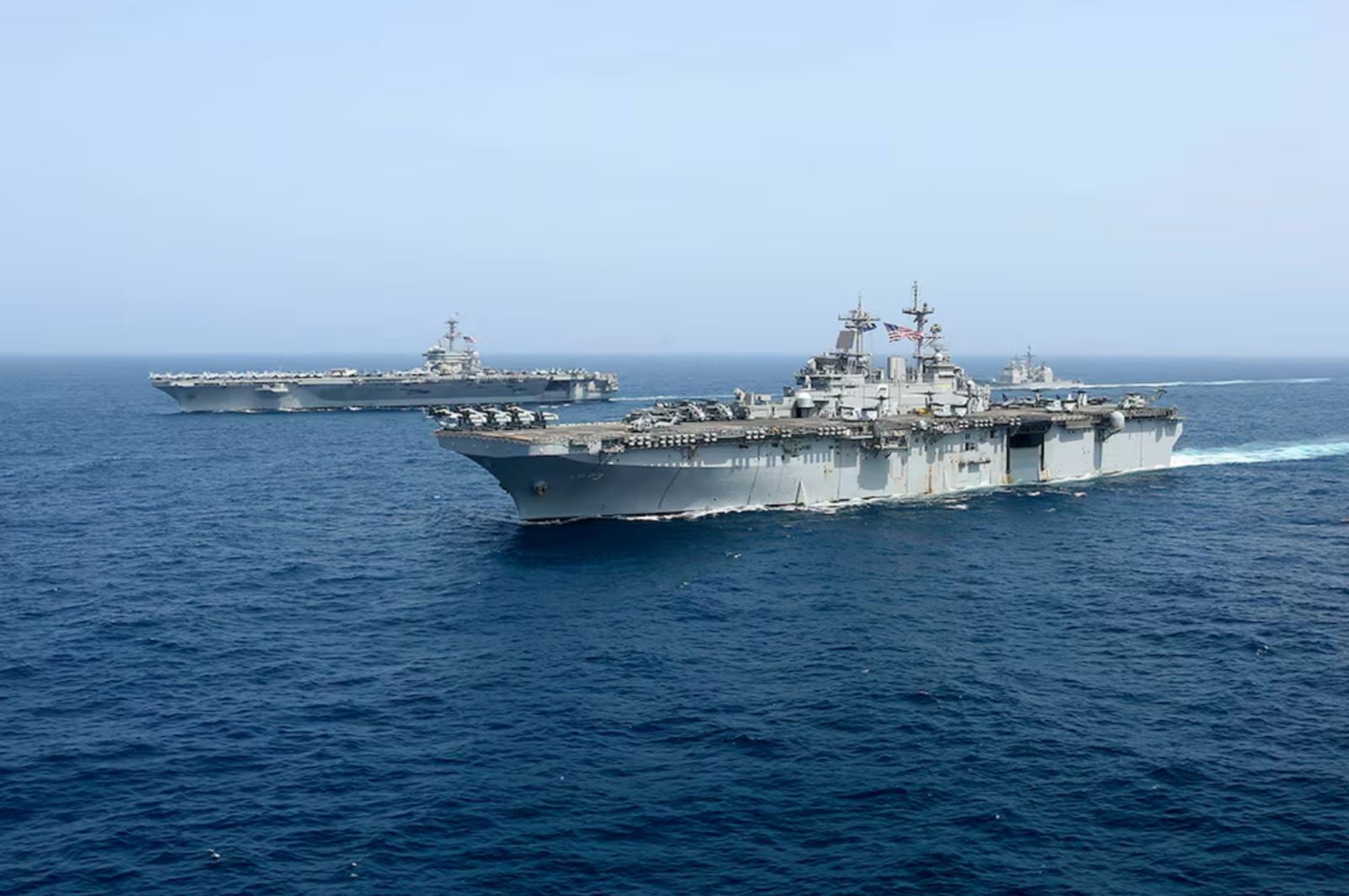 Tàu sân bay USS Abraham Lincoln (phía sau) của hải quân Mỹ di chuyển trên Biển Arab. Ảnh: AP/TTXVN
