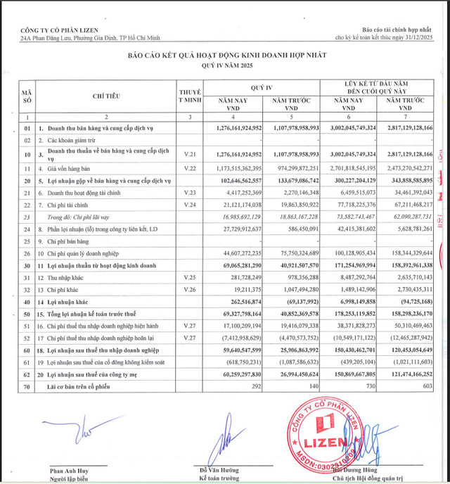 Lũy kế cả năm 2025, Lizen mang về doanh thu thuần 3.002 tỷ đồng,tăng 7% và là mức cao nhất trong 5 năm. Lợi nhuận ròng gần 151 tỷ đồng, tăng24% so với năm trước, đồng thời vượt kế hoạch đã đề ra.