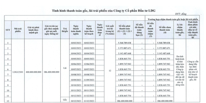 Đây hiện là lô trái phiếu duy nhất còn lưu hành của LDG. Trong các năm 2023 và 2024, doanh nghiệp đã nhiều lần gia hạn nghĩa vụ thanh toán nhưng chưa thể tất toán khoản nợ này.