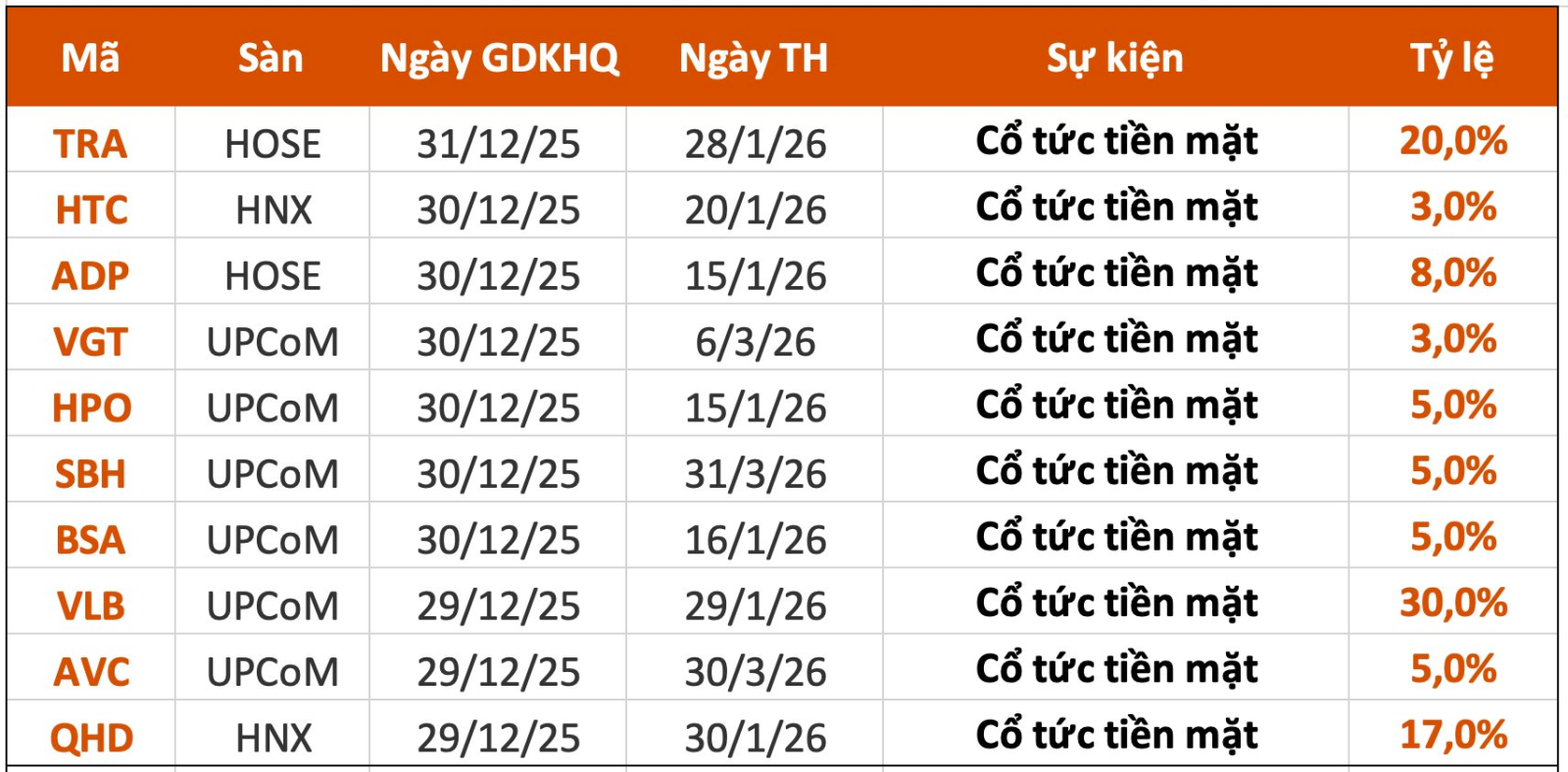 Theo thống kê, có 10 doanh nghiệp thông báo chốt quyền cổ tức trong tuần 29/12– 2/1/2026. Trong đó cả 10 doanh nghiệp trả cổ tức bằng tiền mặt, cao nhất là 30% và thấp nhất là 3%.