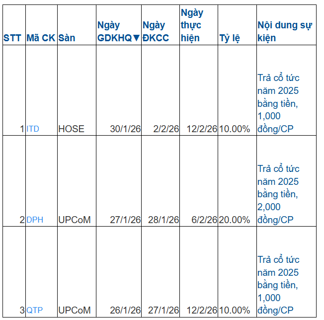 Trong tuần này từ ngày 26-30/1, có 3 doanh nghiệp chốt quyền trả cổ tức bằng tiền, trong đó CTCP (mã chứng khoán DPH) trả cổ tức cao nhất 20% (1 cổ phiếu được nhận 2.000 đồng); còn CTCP Công nghệ ITD (mã chứng khoán CDP) và CTCP Nhiệt điện Quảng Ninh cùng trả cổ tức 10% (1 cổ phiếu được nhận 1.000 đồng).