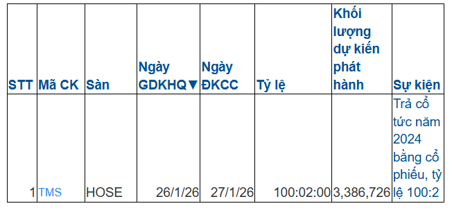 Ngoài ra, cũng trong thời gian này, cũng có CTCP Transimex (mã chứng khoán TMS) chốt quyền trả cổ tức bằng cổ phiếu: