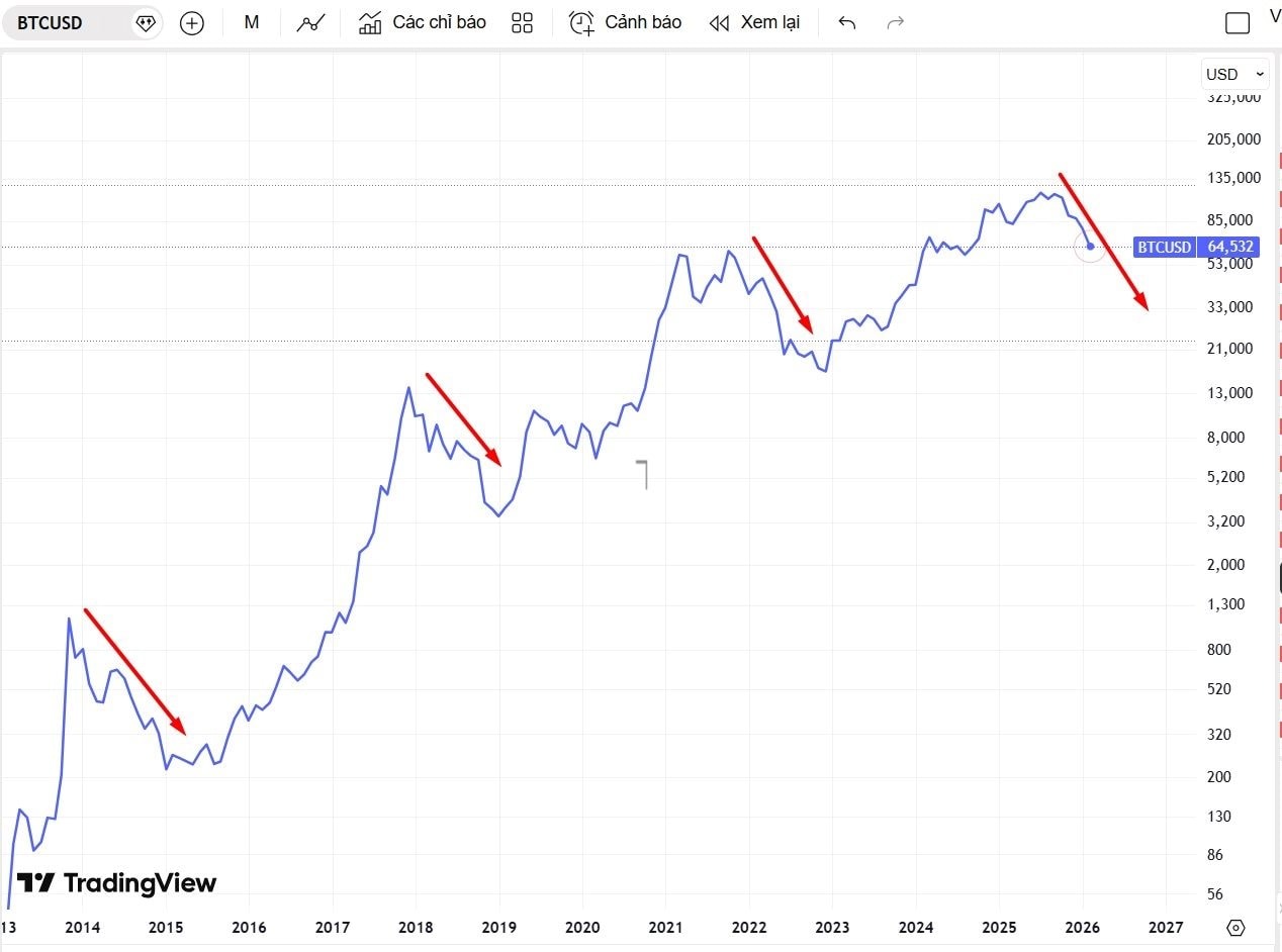 Trên các thị trường tài chính toàn cầu, khái niệm “chu kỳ 4 năm” của tài sản rủi ro đang được nhắc đến nhiều hơn trong thời gian gần đây. Mô hình này thường gắn với các giai đoạn điều chỉnh sâu của Bitcoin và các thị trường chứng khoán, với những điểm rơi đáng chú ý vào các năm 2014, 2018 và 2022.