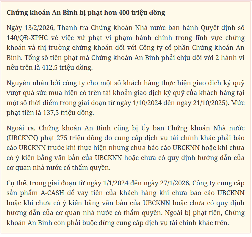 Trước đó, Chứng khoán An Bình từng lên kế hoạch lấy ý kiến cổ đông bằng văn bản lần 1 năm 2026, nhưng đã hủy phương án này và thay vào đó triệu tập sớm ĐHĐCĐ thường niên 2026. Theo kế hoạch, ĐHĐCĐ dự kiến tổ chức ngày 18/3/2026 tại Hội trường tầng M, tòa nhà Peakview, số 36 Hoàng Cầu, phường Ô Chợ Dừa, Hà Nội. Danh sách cổ đông thực hiện quyền tham dự đại hội được chốt vào ngày 23/2/2026.