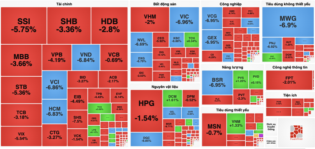 Phiên giao dịch ngày 23/3, VN-Index mất gần 57 điểm, xuyên thủng mốc 1.600 trong bối cảnh chứng khoán châu Á đồng loạt điều chỉnh. Áp lực bán lan rộng ở nhóm vốn hóa lớn như VIC, GVR, MWG, DGC và các cổ phiếu ngân hàng, chứng khoán, khiến chỉ số có phiên giảm sâu thứ ba liên tiếp