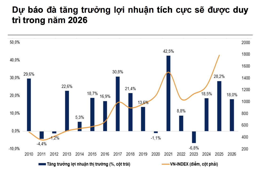 Bên cạnh đó, bất động sản khu công nghiệp và ngành điện được kỳ vọng cải thiện kết quả kinh doanh khi ghi nhận thêm lợi nhuận từ các dự án mới. Tổng thể, đà tăng trưởng của năm 2025 không chỉ mang tính phục hồi mà đang hình thành nền tảng cho chu kỳ lợi nhuận mới trong năm 2026, với cấu trúc tăng trưởng lan tỏa rộng hơn và định giá vẫn ở mức tương đối hấp dẫn so với triển vọng./.
