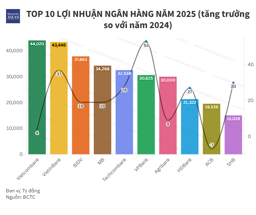 Năm 2025, lợi nhuận toàn ngành ngân hàng tăng trưởng tích cực với sự áp đảo của nhóm Big4 ở nhóm dẫn đầu, trong khi VPBank ghi nhận mức tăng lợi nhuận cao nhất trong Top 10, MB và Techcombank cùng lãi trên 30.000 tỷ đồng.