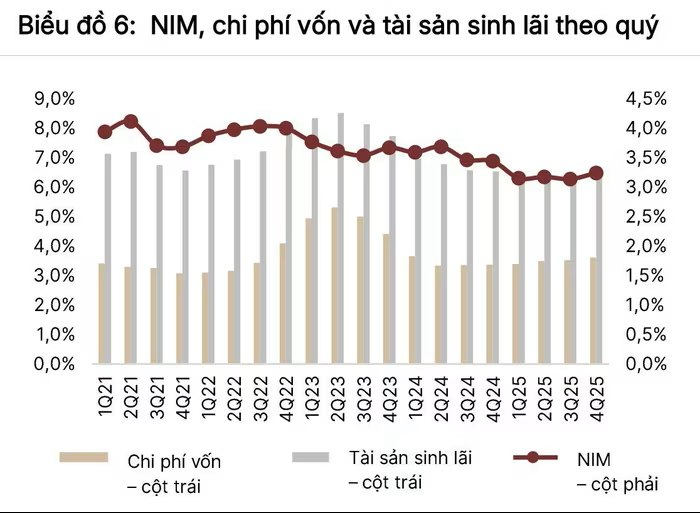Biên lãi ròng duy trì ổn định trong quý IV dù lãi suất huy động tăng mạnh. Chi phí vốn bình quân chỉ tăng khoảng 10 điểm cơ bản do phần lớn tiền gửi lãi suất cao mới phát sinh cuối quý và chưa phản ánh đầy đủ vào chi phí. Đồng thời, lợi suất tài sản tăng 21 điểm cơ bản nhờ gia tăng cho vay vào các lĩnh vực có lợi suất cao hơn như xây dựng, cho vay mua nhà và điều chỉnh lãi suất thả nổi đối với khoản vay cũ.