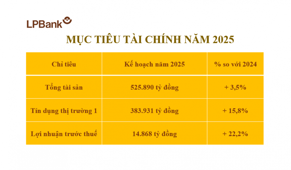 Tại báo cáo HĐQT LPBank trình ĐHĐCĐ, ngân hàng đặt mục tiêu lợi nhuận trước thuế đạt 14.868 tỷ đồng, tăng 22,2% so với kết quả thực hiện năm 2024. Đây là một trong những chỉ tiêu tăng trưởng cao trong vài năm trở lại đây, nằm trong chiến lược phát triển Ngân hàng bền vững và thận trọng, hướng tới Ngân hàng Lộc Phát của mọi nhà.