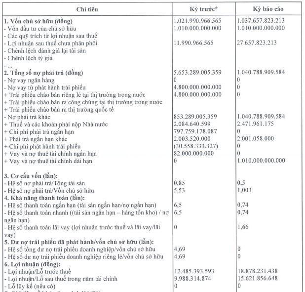 Điểm sáng trong bức tranh tài chính là tổng nợ phải trả giảm tới 4.600 tỷ đồng về mức hơn 1.000 tỷ đồng, qua đó hệ số nợ phải trả/vốn chủ sở hữu cải thiện từ 5,53 lần về còn 1,003 lần. Nguyên nhân do công ty đã tất toán dư nợ trái phiếu và chỉ còn hơn 1.000 tỷ đồng vay nợ tài chính dài hạn.